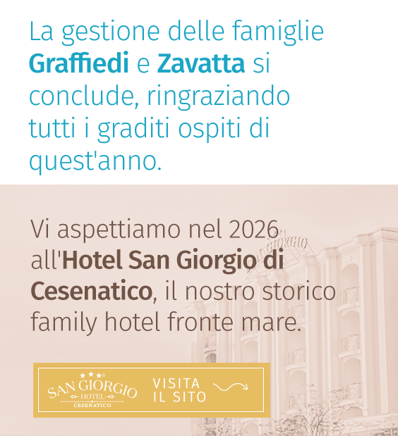 Noi siamo le famiglie Graffiedi e Zavatta, proprietarie anche dell'Hotel San Giorgio di Cesenatico, e non vediamo l’ora di accoglierti in Riviera!